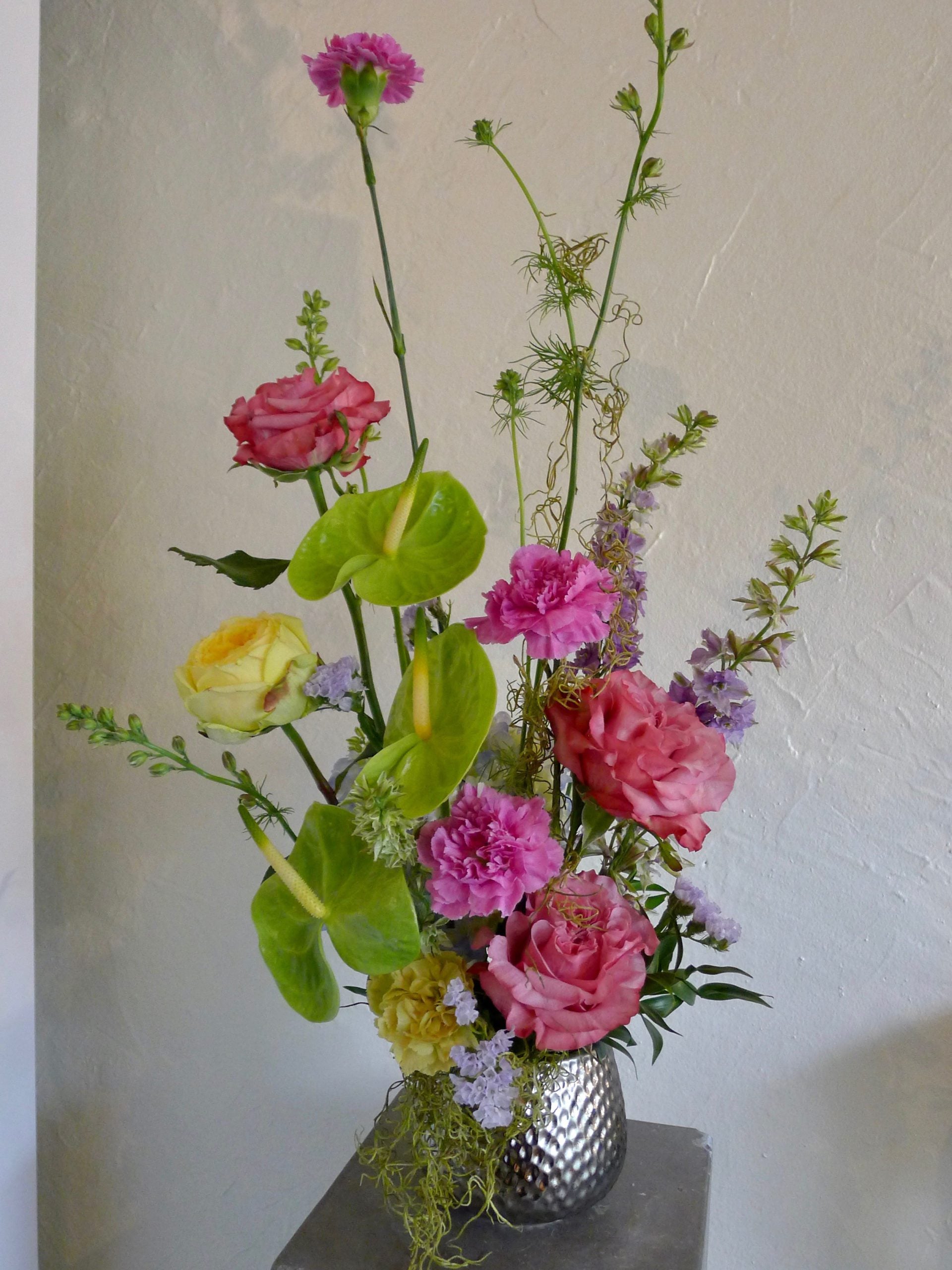 You can expect a recipe of draping moss, fragrant garden roses, specialty carnations, and anthurium orchids. We do not typically keep orchids in stock, so this arrangement requires a longer lead time of 4 days. Be sure to order early, or call if you have an urgent request.