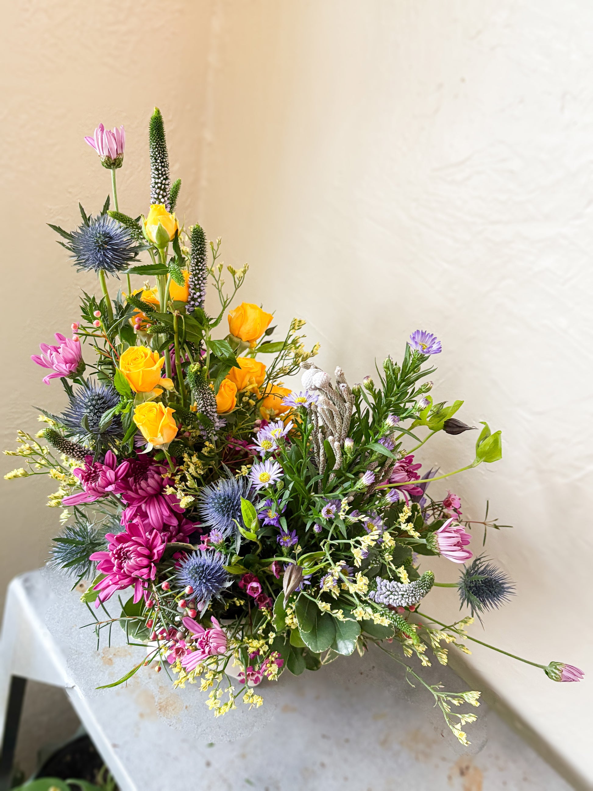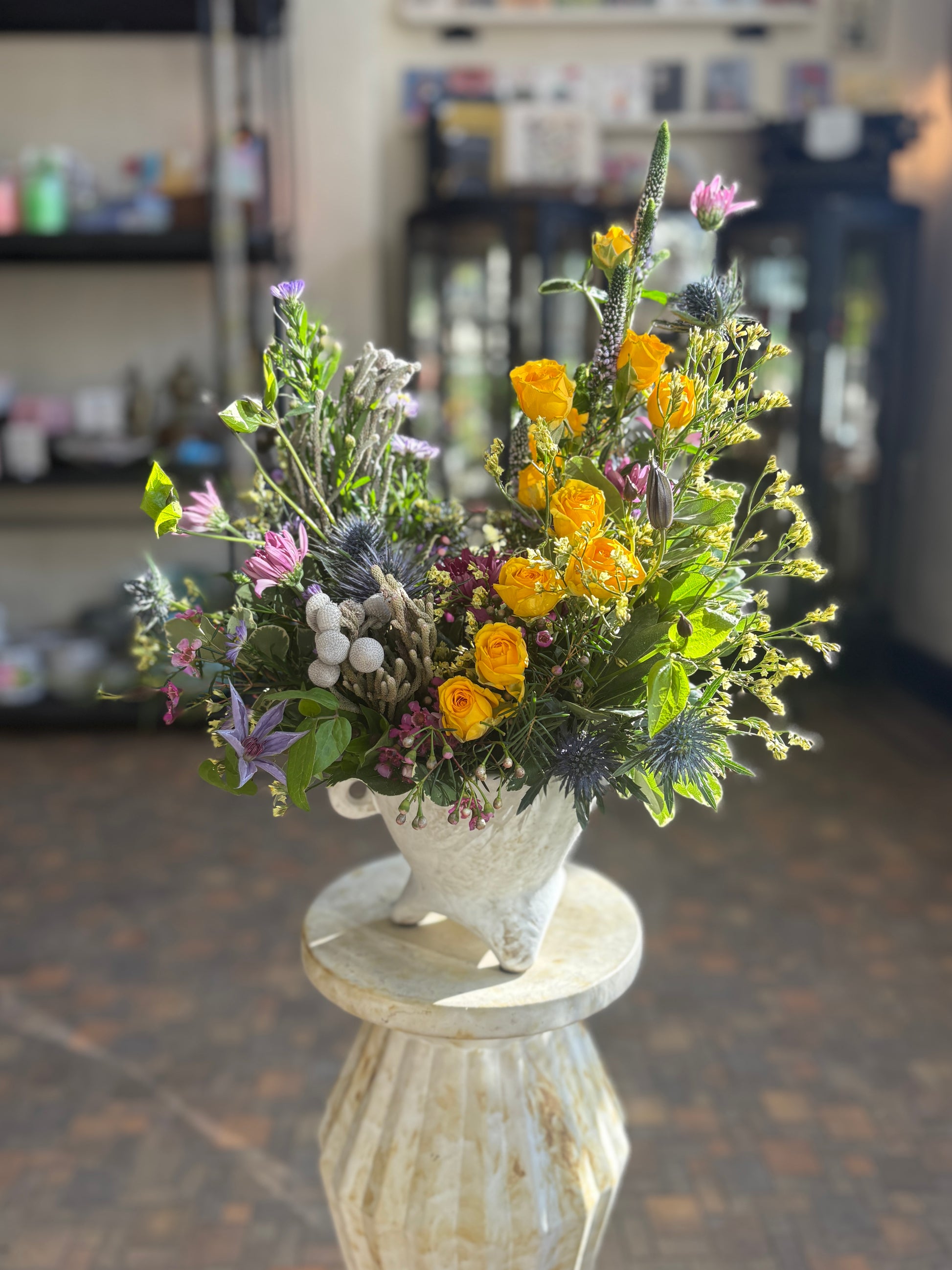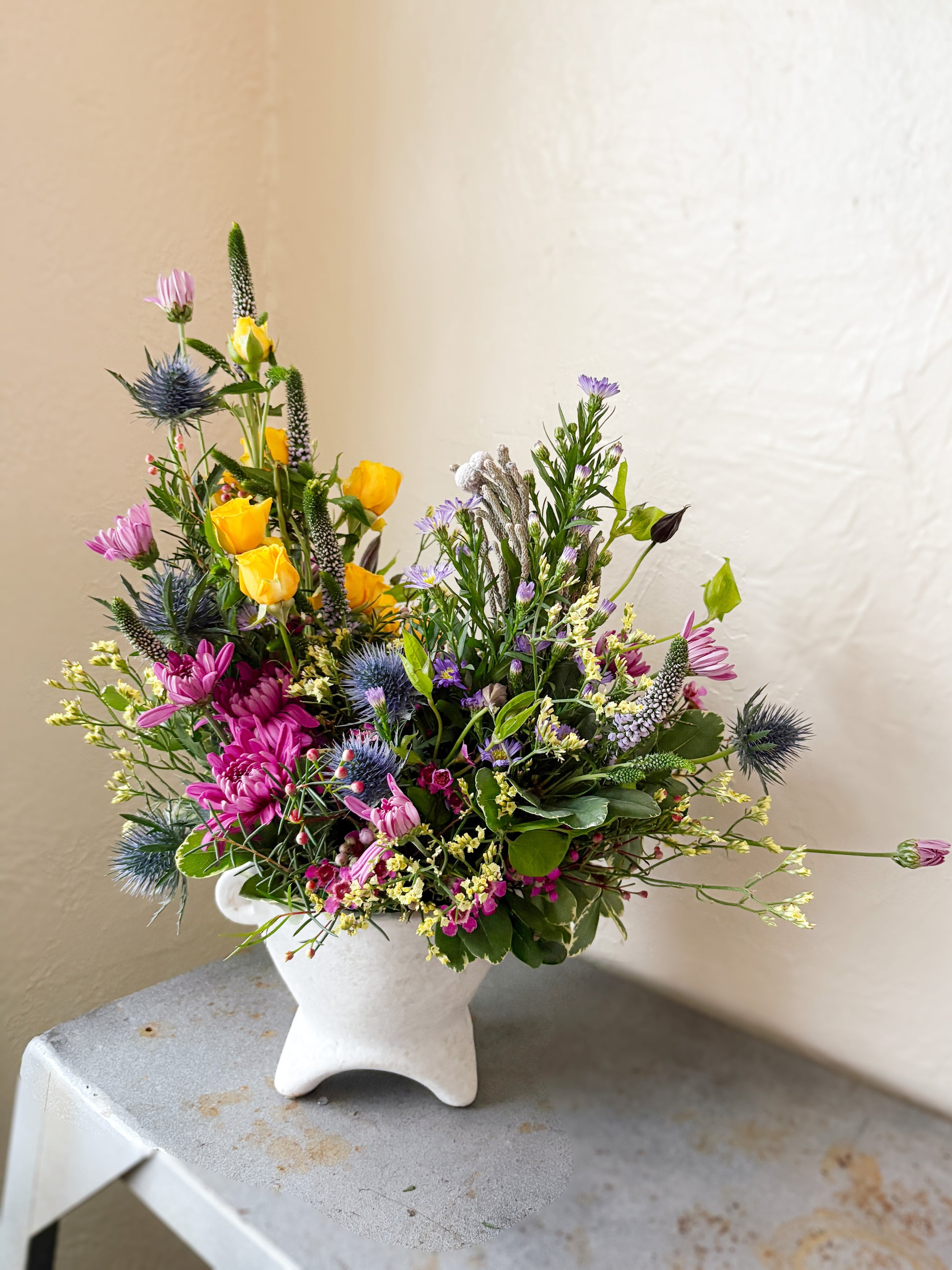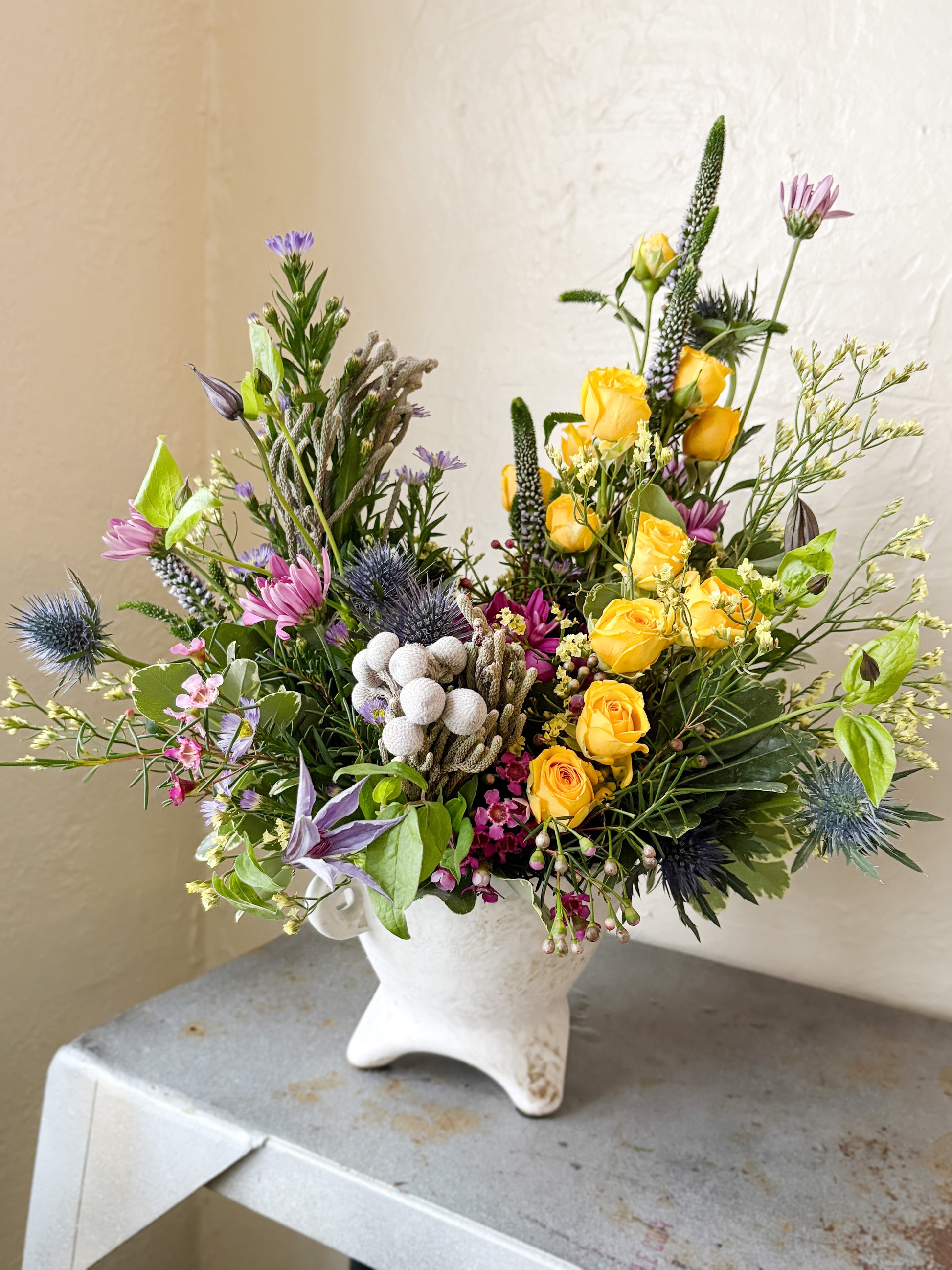 Marianne comes in a three-footed compote and features bright petite roses, blue eryngium, and other specialty blooms. Her colors are decidedly prismatic.