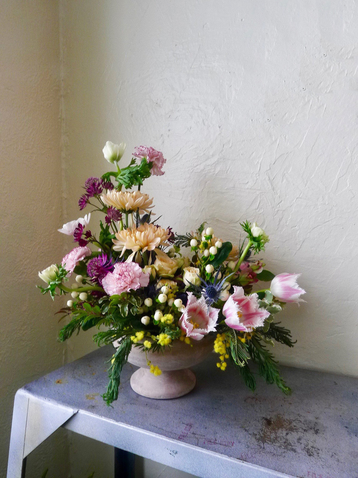 Immersive and sprawling, Thelma comes in a 7″ wide ash pink handcrafted ceramic compote and features seasonal flowers and foliage. Bursting with locally sourced blooms like tulips, narcissus, hyacinths, and anemones in a refined palette of muted and plum tones. Delicately arranged amidst verdant greenery, these flowers evoke the essence of a springtime garden in full bloom. The low and lush design is the ideal dinner table accompaniment.